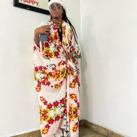 The 3 piece floral dress set includes: kimono gown, trouser and head band.